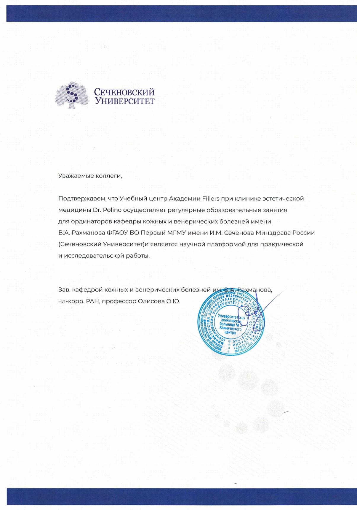 Благодарим Сеченовский Университет за доверие. Совместными усилиями мы стремимся к развитию науки и эстетической медицины.